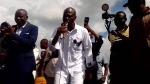 Martin Fayulu qui a été accueilli par plusieurs centaines de personnes de l’aéroport de Lungandu jusqu’au terrain du collège Saint Pie X dans la commune de Katoka s’est adressé à la population dans un meeting populaire.