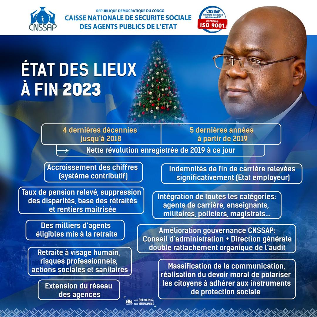 Au nom du personnel de la CNSSAP et en nos noms respectifs, nous présentons nos vœux les meilleurs de santé, de bonheur et de succès pour la conservation des acquis à Son Excellence Monsieur le Président de la République Félix Antoine TSHISEKEDI, garant du bon fonctionnement des institutions et de la paix sociale. Les mêmes vœux de bonne santé et de progrès perpétuel pour l’année 2024 sont adressés à tous et à chacun au nom du Très Haut !